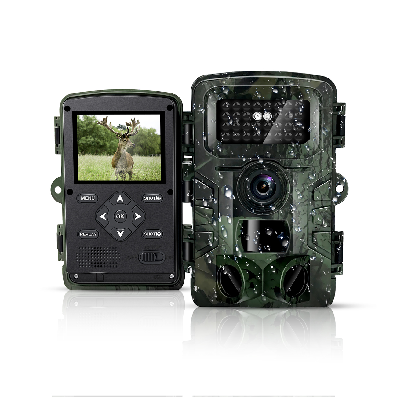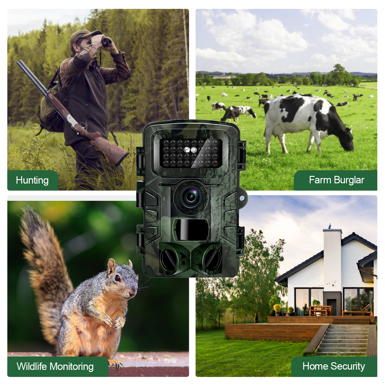 Die HAZA-Wildkamera ist mit einem ultraklaren CMOS-Sensor, einem Objektiv mit großer Blende und intelligenter Bildgebung ausgestattet, um eine klare Nachtsichtaufnahme zu erzeugen. Die HAZA HD-Wildkamera verfügt über brandneue, innovative und ultraklare Bildgebungstechnologie, um hochauflösende Bildqualität zu liefern. Sie verfügt ebenso über eine schnelle Auslösegeschwindigkeit und eine nicht leuchtende, unsichtbare Infrarot-Technologie, die sich perfekt für das Aufspüren von Wildtier im Freien und die Sicherheit im eigenen Heim eignet, weil sie gut getarnt ist und Tiere nicht verschreckt.